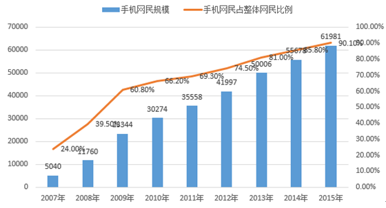 中國(guó)手機(jī)網(wǎng)民規(guī)模持續(xù)增長(zhǎng),為移動(dòng)互聯(lián)網(wǎng)打下了堅(jiān)實(shí)的用戶(hù)基礎(chǔ)。根據(jù)數(shù)據(jù),截至 2015 年末,我國(guó)手機(jī)網(wǎng)民規(guī)模達(dá) 6.20億,網(wǎng)民中使用手機(jī)上網(wǎng)人群的占比為90.1%,手機(jī)成為第一上網(wǎng)終端,移動(dòng)增值業(yè)務(wù)市場(chǎng)整體前景廣闊。
