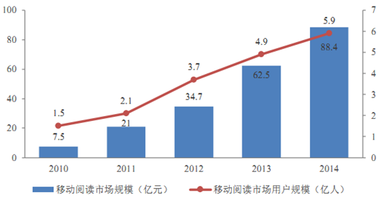 2014 年我國(guó)移動(dòng)閱讀市場(chǎng)規(guī)模為 88.4 億元,較 2013 年同比增長(zhǎng) 41.4%;移動(dòng)閱讀活躍用戶數(shù)量規(guī)模為 5.9 億,較 2013 年的 4.9 億增長(zhǎng) 20.9%。2010 年至 2014 年,我國(guó)移動(dòng)閱讀市場(chǎng)規(guī)模的復(fù)合增長(zhǎng)率為 85.3%,移動(dòng)閱讀活躍用戶數(shù)量的復(fù)合增長(zhǎng)率為40.8%。