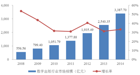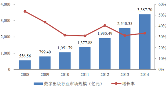 2014 年我國(guó)數(shù)字出版行業(yè)市場(chǎng)規(guī)模為3,387.7 億元,同比增長(zhǎng)33.36%,數(shù)字出版業(yè)收入占新聞出版業(yè)收入的比例由2013年的 13.9%提升至 2014 年的 17.1%。