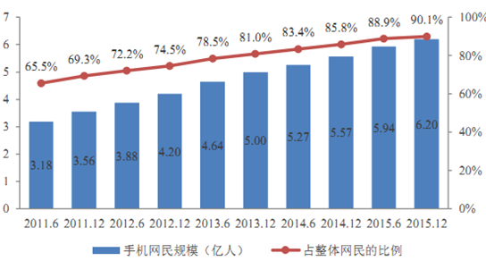 隨著智能手機(jī)、平板電腦、電子閱讀器等移動(dòng)智能終端的逐漸普及、移動(dòng)網(wǎng)絡(luò)帶寬的持續(xù)改善以及 WIFI 基礎(chǔ)設(shè)施的不斷增強(qiáng),移動(dòng)互聯(lián)網(wǎng)用戶和訪問(wèn)量在近年來(lái)呈現(xiàn)高速增長(zhǎng)態(tài)勢(shì)。據(jù)統(tǒng)計(jì),截至 2015 年 12 月,我國(guó)手機(jī)網(wǎng)民規(guī)模達(dá) 6.20 億,較 2014 年底增加 6,303 萬(wàn)人。我國(guó)網(wǎng)民上網(wǎng)設(shè)備中,手機(jī)使用率達(dá) 90.1%,較 2014 年底上升4.3%,已成為第一大上網(wǎng)終端設(shè)備。據(jù)顯示,我國(guó) 2014 年全年移動(dòng)電話普及率由90.8%升至年底的 94.5%。