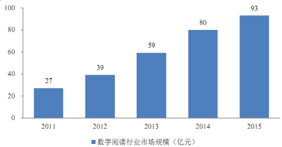 互聯(lián)網(wǎng)數(shù)字閱讀是互聯(lián)網(wǎng)數(shù)字出版行業(yè)的重要細(xì)分領(lǐng)域。數(shù)字閱讀行業(yè)自2011 年后進(jìn)入高速發(fā)展期,2015 年后將邁入成熟發(fā)展期。2015 年我國(guó)數(shù)字閱讀行業(yè)市場(chǎng)規(guī)模達(dá) 93 億元,同比增長(zhǎng) 16.25%。