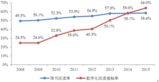 2015 年我國(guó)成年國(guó)民圖書閱讀率為 58.4%,較 2014 年上升 0.4%;數(shù)字化閱讀方式的接觸率為 64.0%,較 2014 年上升 5.9%;51.3%的成年國(guó)民進(jìn)行過(guò)網(wǎng)絡(luò)在線閱讀,較2014 年上升 1.9%;60.0%的成年國(guó)民進(jìn)行過(guò)手機(jī)閱讀,較 2014年上升8.2%。