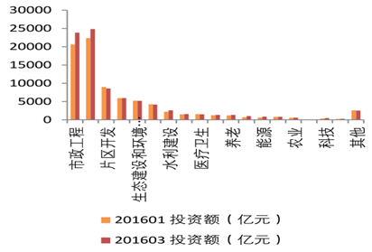 2016 年 3 月,財政部 PPP 項目庫中市政工程項目數和投資額均居于 19 個細分領域第一位,其中項目數 2704 個,占比 35.02%;投資額約 2.38 萬億元,占項目庫總投資額的 27.16%。