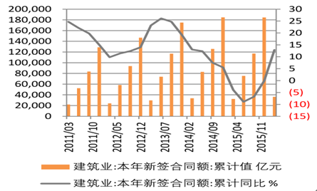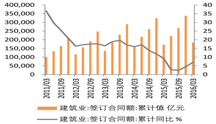 建筑業 1 季度新簽合同訂單放量,同比增速實現 2 位數增長。2016 年 1 季度新簽合同額 3.64 萬億元,新簽合同同比增長 12.91%;期間,建筑業累計簽訂合同額 18.41 萬億元,同比增長 7%,較上年同期下滑 2.26 個百分點。新增合同數據改善,但行業整體在手合同仍然低于上年同期,建筑行業固定資產投資整體表現趨同,短期數據向好,但持續性不確定性較強。