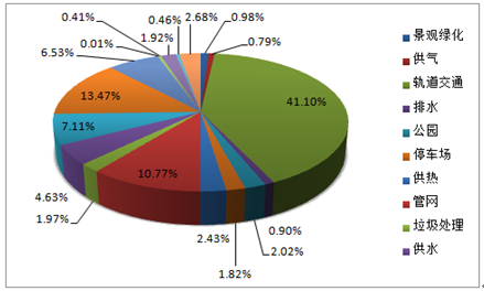 軌道交通項目占據市政工程項目投資額的 41.1%, 接近半壁江山。 2016 年 3 月底, 2704 個市政工程 PPP 項目中, 軌道交通項目 66 個,項目數量占比不大,但投資額高達 9800 億元,占市政工程 PPP 項目投資額 2.38 萬億元的 41.1%。