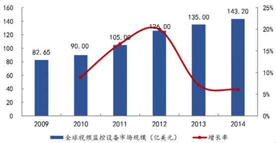 經過多年的發展,全球安防視頻監控行業市場規模不斷增長。一方面,隨著全球恐怖攻擊、意外事件不斷發生,促使全球重視安全議題,人們安全防范意識逐漸增強,對安全防范的需求增長較快。另一方面,隨著全球經濟的發展、科技的進步及資本的推動,安防監控產品不斷更新換代,產品功能越來越豐富,進一步增強了安防視頻監控產品的吸引力,從而使其不斷向各個下游應用行業滲透。此外,由于發展中國家城市化進程加速、基礎設施投資增加等因素,其對安防產品需求更為強烈。數據顯示,2014 年,全球安防視頻監控設備的市場規模由 2009 年的 82.65 億美元增長了73.26%,達到了143.20 億美元,年復合增長率為11.62%。