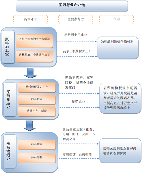 醫藥行業的產業鏈主要包括原料加工業、醫藥制造業、醫藥流通業及醫療服務業等,產業鏈各環節具體情況如下: