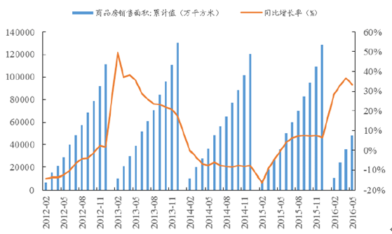 房地產行業在經歷2014 -15年低潮期之后,近期出現回暖趨向,首先房地產新開工面積出現反彈,至2016年5月末全國房地產新開工面積為5.95億平方米,相較去年同期增加0.92億平方米,但仍然低于2013年水平,增長率也低于近幾年的最高水平,并未出現真正的反轉。