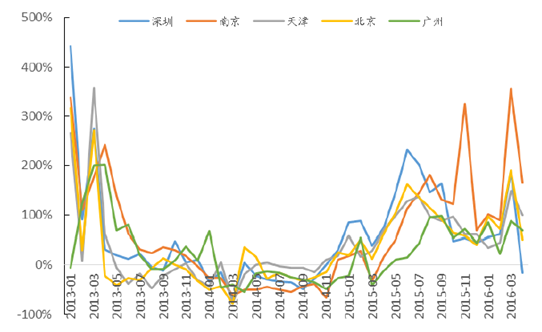 2013-2016年各大城市二手房成交面積同比增長率