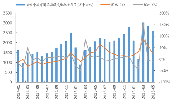 30大中城市商品房品銷售面積數據也反映出房地產銷售市場的火熱,年初以來至5月末,30大中城市房地產銷售面積較去年同期大幅增長,2016年1月至5月銷售面積分別為2098.29萬平方米,1176.323萬平方米,3028.46萬平方米,2861.66萬平方米,2590.97萬平方米,3、4月份的銷售面積同比增長率高達50%以上,在環比增長率方面,由于3月份房地產成交量創出近年來的新高,使得4月環比下降-5.5%,5月環比下降-9.5%。但3月至5月都居于近年來的高位,反映出房地產銷售的回暖。