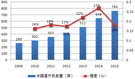 2009-2015年中國大陸/大中華區直升機歷年保有量與增速