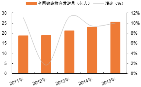 2011-2015年全國鐵路旅客發送量與增速