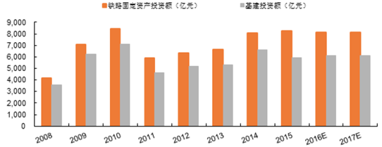 2015年,全國鐵路行業完成固定資產投資8238億元;國務院副總理馬凱在今年鐵路建設工作會議上強調,今年確保完成鐵路投資8000億元以上。