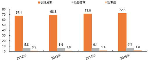 2015年,全國鐵路客車擁有量為6.5萬輛,比上年增加0.4萬輛;動車組1.8萬輛,比上年增加3952輛,全國鐵路貨車擁有量為72.3萬輛,同比減少1.3萬輛;全國鐵路貨車的保有量趨于飽和,隨著高鐵與軌道交通通車里程的增加,動車組與軌道交通車輛的需求將保持上升。