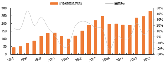 全球通用行業器產業年銷售額從1995年的43億美元增長到2015年的約280億美元,年均增速約為11.3%。
