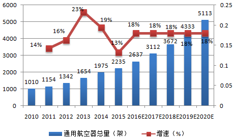 2016年5月,國務院辦公廳印發了《關于促進通用航空業發展的指導意見》,提出到2020年,通用航空器達到5000架以上,通用航空業經濟規模超過1萬億元;“十三五”期間,國內通用航空器數量預計年均增速在18%以上。