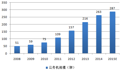 中國公務機機隊數量將近300架,未來五年有潛力購買公務機的需求為2320架,總價值將超4600億元。北美與歐洲公務機市場分別有12000多架與2000多架,與發達國家比較,中國公務機市場發展空間巨大;2008年-2015年,中國公務機保有量的年均增速約為33%。