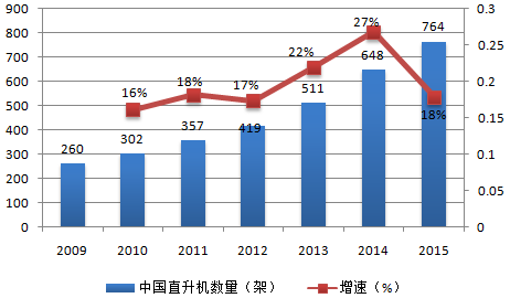2009-2015年中國大陸/大中華區直升機歷年保有量與增速