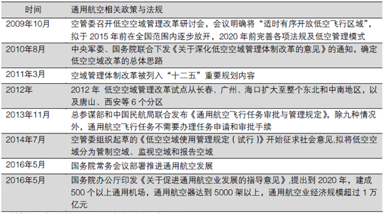 作為發展相對滯后的大產業,我國政府已經認識到通用航空對于拉到國家GDP、創造就業等方面的巨大作用,發展通用航空的政策扶持力度相繼出臺。2016年5月,國務院辦公廳印發《關于促進通用航空業發展的指導意見》,提出到2020年,建成500個以上通用機場,通用航空器達到5000架以上,通用航空業經濟規模超過1萬億元。