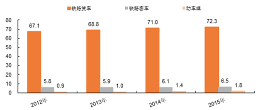 2015年,全國鐵路客車擁有量為6.5萬輛,比上年增加0.4萬輛;動車組1.8萬輛,比上年增加3952輛,全國鐵路貨車擁有量為72.3萬輛,同比減少1.3萬輛;全國鐵路貨車的保有量趨于飽和,隨著高鐵與軌道交通通車里程的增加,動車組與軌道交通車輛的需求將保持上升。