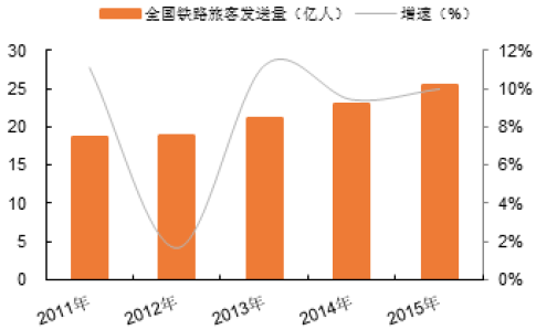 2011-2015年全國鐵路旅客發送量與增速