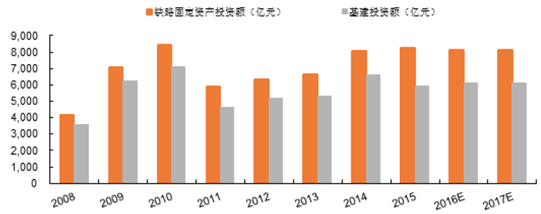2015年,全國鐵路行業完成固定資產投資8238億元;國務院副總理馬凱在今年鐵路建設工作會議上強調,今年確保完成鐵路投資8000億元以上。