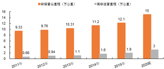 根據鐵路“十三五”發展規劃,“十三五”期間,鐵路固定資產投資規模預計將達3.8萬億元,到2020年,全國鐵路營業里程達到15萬公里,其中高速鐵路3萬公里。