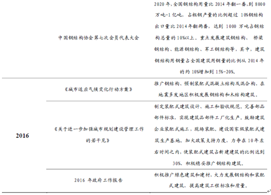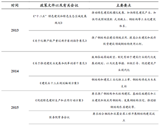 隨著綠色/環保、美麗中國被寫入‚十三五規劃,國家將加大對低能環保的建筑強調力度。建筑產業必將向集約化、工業化轉變,大力推進節能減排,提高經濟效益。自2013年以來,中央政府就密集出臺了一系列政策文件,推進鋼結構建筑行業的發展。2016年3月5日,李克強總理在2016政府工作報告中倡導:積極推廣綠色建筑和建材,大力發展鋼結構和裝配式建筑,提高建筑工程標志和質量。綠色建筑產業化,為未來的鋼結構發展開拓了廣闊的發展空間。政府關于鋼結構政策文件的陸續出臺,這將對推廣鋼結構建筑起到直接的刺激作用。