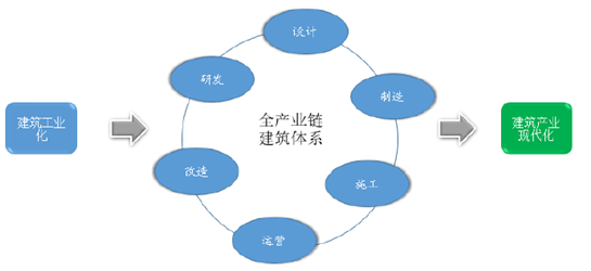 建筑產業現代化集研發、設計、制造、施工、運營、改造為一體,并形成完整的產業鏈,這是建筑工業化向建筑產業化的轉變最重要表現。