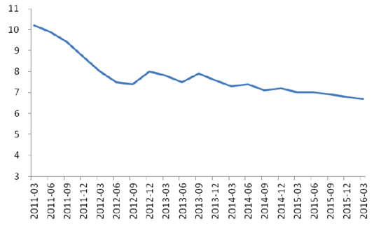 2016年1-4月份,固定資產投資13.26萬億元,同比名義增長10.50%,增速比1-3月份回落0.2個百分點,與2015年同期比,增速下降了1.5個百分點。而民間投資下降更快,同期民間固定資產投資82393億元,同比名義增長5.2%,增速比1-3月份回落0.5個百分點(注:1-3月份民間固定資產投資同比名義增長5.7%)。民間固定資產投資占全國固定資產投資(不含農戶)的比重為62.1%,比去年同期降低3.2個百分點。