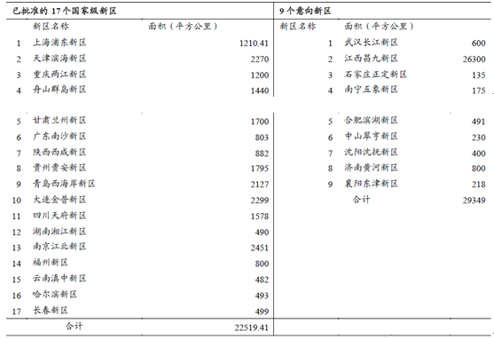 這些國家級新區規劃的實施直接拉動大型公共建筑的建設,根據統計,已經批準的17個國家級新區面積達到22519平方公里;而擬申報的國家級新區面積達到了29349平方公里。
