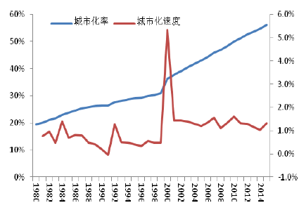 根據國家統計局數據,2015年中國城鎮化率達到56.10%。而發達國家的城市化水平為75%左右。而根據有關學者的研究,當城市化水平達到飽和值的50%時,城市化速度達到極限,并且以此為分界點,此前加速此后減速。