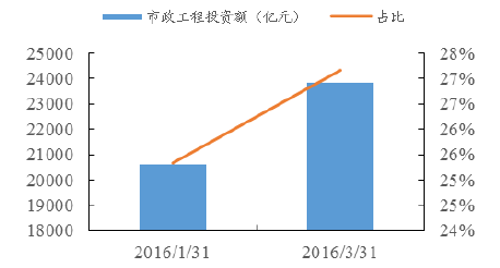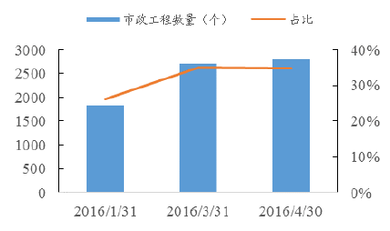 市政工程項目由于具有基礎、公用的特點,投入巨大,投資收益一般不高,但其一般具有穩定、長期的收入流,是政府基礎設施中的重要項目,隨著國家在投資端的加大投入,板塊內公司業績或將爆發。截止2016年3月末,在財務部推介的PPP項目,其中市政工程領域項目共有2800項,占到總項目項目數的34.8%。總投資額為2.38萬億元。4月末市政工程板塊企業業績或將得到較大提升。
