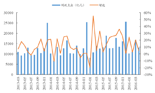 另一方面,在國家經濟疲軟背景下,政府部門為了熨平經濟周期,必然會加大投資力度,政府部門財政支出增長迅速,2016年1月至4月公共財政支出分別為1.01萬億元、1.10萬億元、1.68萬億元、1.31萬億元,相較去年同期分別增長1997.34億元、307.77億元、2837.93億元、574.82億元。