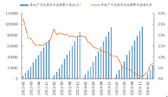 在房地產需求方面,在經歷前期房地產投資增速快速下滑期之后,自2016年年初,房地產投資增速實現反彈。2016年3至5月的房地產投資額分別為0.86萬億元、0.76萬億元、0.92萬億元相較去年同期大幅上升。2015年12月至2016年4月的投資完成額累計值同比增長率分別為0.99%,3.02%,6.16%,7.21%。