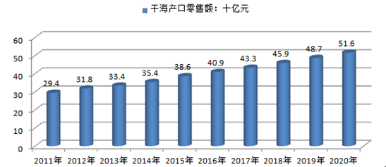 顯示:中國干海產品的零售額由2011年的約人民幣294億元增加至2015年的約人民幣386億元,復合年增長率約為7.0%。隨著居民收入的提高,健康意識的提升及干海產品的消費區域不斷擴大,估計干海產品零售銷售額將于2016年至2020年期間按復合年增長率約6.0%繼續增長,預計將于2020年達到約人民幣516億元。