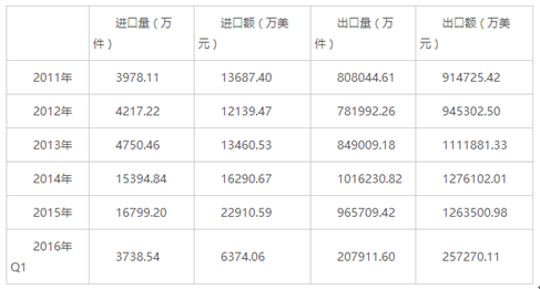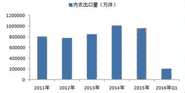 2015年,我國內衣進口量為1.68億件,進口額為2.29億美元,出口量為96.57億件,出口額為126.35億美元;2016年一季度,我國內衣進口量為3738.54萬件,進口額為6374.06萬美元,出口量為20.79億件,出口額為25.73億美元。