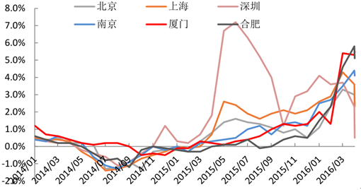 從房價表現來看,2016年5 月 70 個大中城市房價環比上漲 0.9%,同比上漲 5.2%,連續十四個月環比上漲。隨著 3.25 月新政的出臺,深圳上海房價上漲有所放緩,核心事線城市廈門、合肥、南京逐步扛過領漲的大旗,2016年5 月環比分別上漲 5.5%、5.1%和 4.1%。