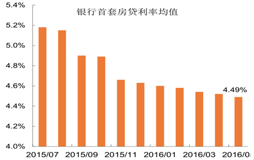 流動性方面,盡管相比 2015 年多次降準降息,2016 年目前僅 3 月 1 日下調存款準備金 0.5 個百分點,但從 M2 增速來看,1-5 月 M2 增速持續處于高位。同時由于持續量寬的貨幣政策疊加下行的經濟壓力,相對優質的個人住房按揭貸款受到銀行的青睞,5 月全國 35 個大中城市首套房貸款利率在基準以下的占比達 82%,而停貸的銀行百分比僅 1.56%。開展首套房貸款業務的 519 家銀行平均利率為 4.49%,環比下降 0.03 個百分點,繼續創新低。