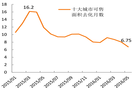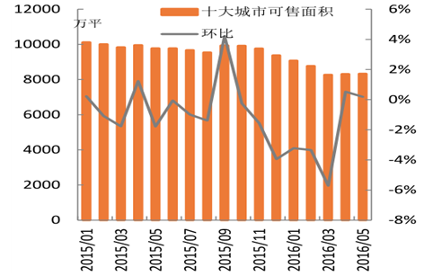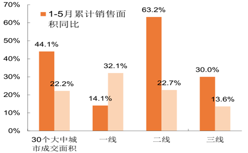 2016年1-5 月全國商品房銷售面積同比增長 33.2%,30個重點城市成交同比增長 44.1%。市場熱點逐步由一線城市向核心事線城市蔓延,1-5 月事線城市成交同比增長 63.2%,高于一線城市(14.1%)和三線城市(30.0%) ,下半年隨著基數抬升及部分需求透支,預計銷售同比增速將逐步收斂。
