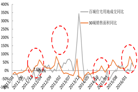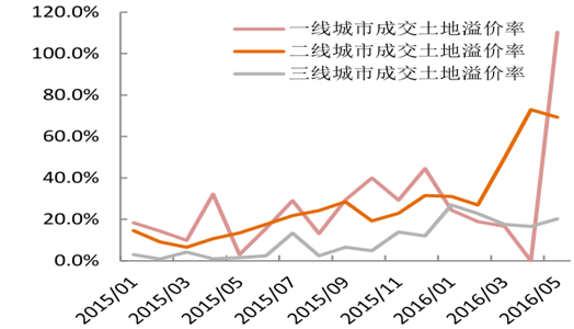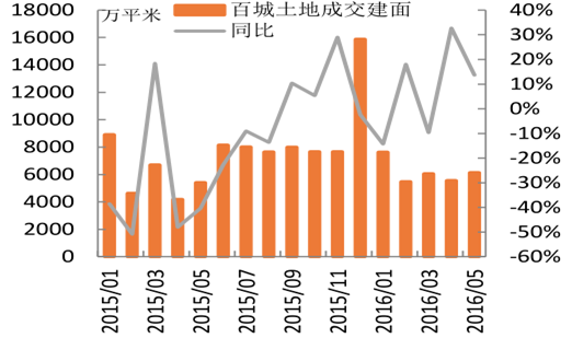 2016 年 1-5 月百城土地成交建面同比增長 3.4%,較 2015 年全年增速回升 20 個百分點。由于三四線依舊較高的庫存,核心一事線城市成為主流房企爭奪的焦點,5 月一、二線城市土地成交平均溢價率分別高達 110%和 69%。從成交占比來看,房企進一步聚焦核心事線,1-5 月二線城市土地成交占比 48%,較 2015 年全年提升 5.4 個百分點。