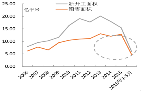 受益銷售回暖,監測的重點城市可售面積 5 月末較 2012年底下降 11.2%,去化月數改善更為明顯,重點跟蹤城市去化月數已下降至 6.75 個月,較 2015年高點下降 9.5 個月,處于歷史較低水平。從全國數據來看,全國商品房新開工與銷售面積剪刀差持續收斂,施工面積同比增速不斷下滑,亦反映出庫存下滑的趨勢。