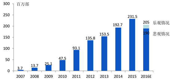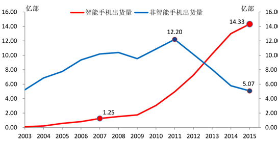 智能手機因為具有獨立的操作系統,能夠下載安裝豐富的應用軟件,能夠滿足消費者需求的多樣性。 而隨著智能手機硬件和應用軟件的飛速發展, 對非智能手機帶來的替代作用越來越明顯。自 2011 年以來,非智能手機的出貨量出現了非常顯著的下滑,至 2015 年,非智能手機的出貨量仁約為智能手機的三分之一。