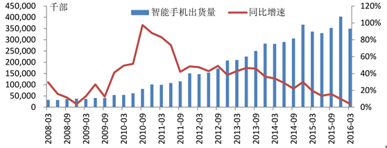 進入 2016 年,由于滲透率處于高位,硬件和軟件的創新遭遇瓶頸,智能手機出貨量或正遭遇進入爆發期以來的困難。僅 IDC 公布的 2016 年第一季度全球智能手機出貨量 3.5 億部同比增長了 3.9%來看,銷量增速呈現大幅放緩的趨勢,作為龍頭的蘋果公司 2016 年一季度已經出現負增長。智能手機時代或正宣告結束,全球科技發展新的時代或正在到來。