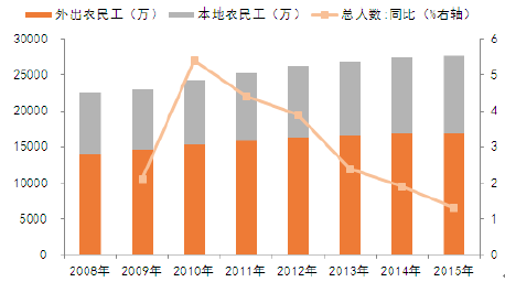 2008-2015 年農(nóng)民工總數(shù)及增速