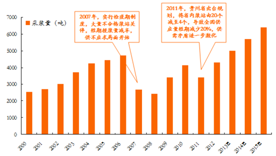 目前國內(nèi)采漿量約5000噸,而理論需求量在8000噸左右,處于嚴重供不應求狀態(tài),未來較長時間內(nèi)難以得到根本改善。在賣方市場的狀態(tài)下,血制品企業(yè)產(chǎn)品銷路不愁,關(guān)鍵問題是原材料的供給,即如何擴大采漿量。