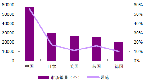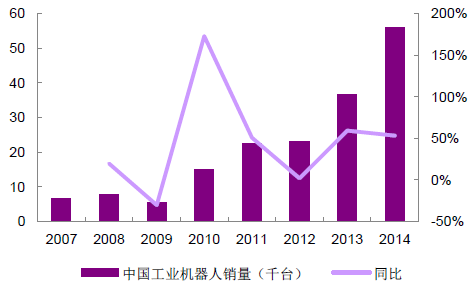中國是全球最大的工業機器人市場。2014 年銷售總量達到5.7 萬臺,占全球份額的四分之一,比全球第二大銷售市場日本高出近一倍的數量,保有量約40 萬臺,遠超全球平均水平。