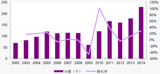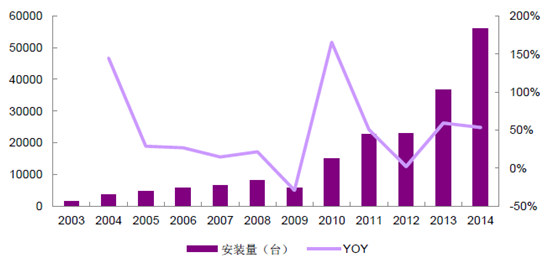 核心提示:自2009 年起全球工業機器人供應量迅速增長,5 年內年平均增速達到30%以上,到2014 年全球機器人供應量22.9 萬臺,同比增長28.54%; 銷售額達到106 億美元,同比增長11.58%;根據國際機器人協會(IFR)預測,按照15自2009 年起全球工業機器人供應量迅速增長,5 年內年平均增速達到30%以上,到2014 年全球機器人供應量22.9 萬臺,同比增長28.54%; 銷售額達到106 億美元,同比增長11.58%;根據國際機器人協會(IFR)預測,按照15%的平均增速計算,到2018 年全球機器人供應量可達到40 萬臺, 銷售額可達到160 億美元以上。