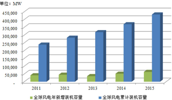 風電作為一種可持續且環保的新興能源在許多國家的戰略能源結構中扮演著重要角色, 并日益受到各國的重視。 近年來, 全球風能產業政策法規陸續出臺,對可再生能源的關注度不斷提高,風電并網技術逐漸成熟,風電行業迅速發展。2001 年至 2015 年全球風電累計裝機容量從23,900MW 增至 432,419MW,復合增長率為 22.98%。隨著全球風電行業的蓬勃發展,風電設備的市場需求呈現良好的發展態勢。目前全球風電設備企業主要分布在亞洲、歐洲、美洲等地區,由于歐洲等地區的勞動力成本較高,部分歐洲風電企業把生產基地轉移到人工成本較低的亞洲國家和地區。