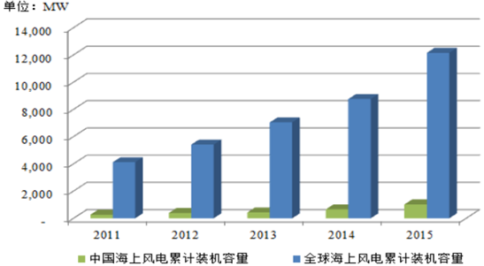 此外,海上風電不占用土地資源,且接近沿海用電負荷中心, 就地消納避免了遠距離輸電造成的資源浪費。 據統計, 2015年全球海上風電新增裝機容量為 3,392MW,其中歐洲新增 3,028MW,占全球新增裝機容量的 89.27%;德國在海上風電市場保持領先位,全年新增海上風電裝機 2,282MW, 占歐洲的 75.36%, 其次是英國 566MW, 占歐洲的18.69%3。 2015年,中國海上風電項目也取得突破性增長,新增裝機 100 臺,新增容量達到360.5MW,同比增長 57.64%,排名全球第三位。截至 2015 年底,中國累計海上風電裝機容量共計 1,014.68MW4。